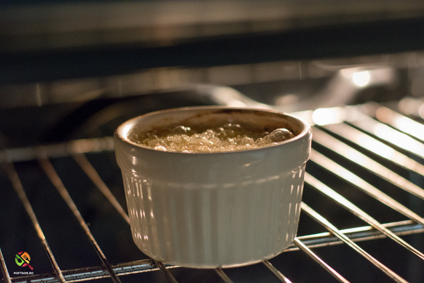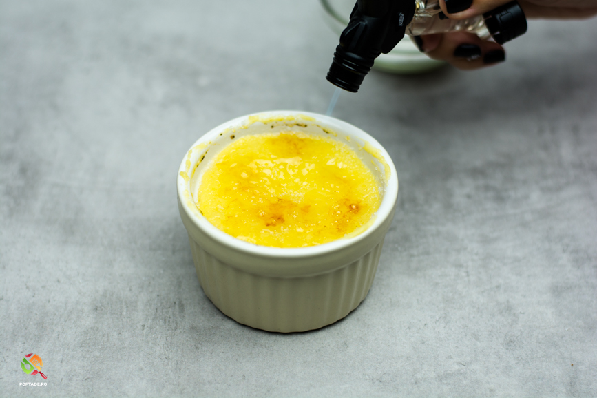 Pentru aceasta reteta am folosit doua vase termorezistente cu diametrul de 8 cm intrucat vom folosi o torta cu gaz pentru a carameliza zaharul. De asemenea, crema de vanilie trebuie preparata inainte de montarea desertului iar acesta trebuie sa fie foarte putin calda
