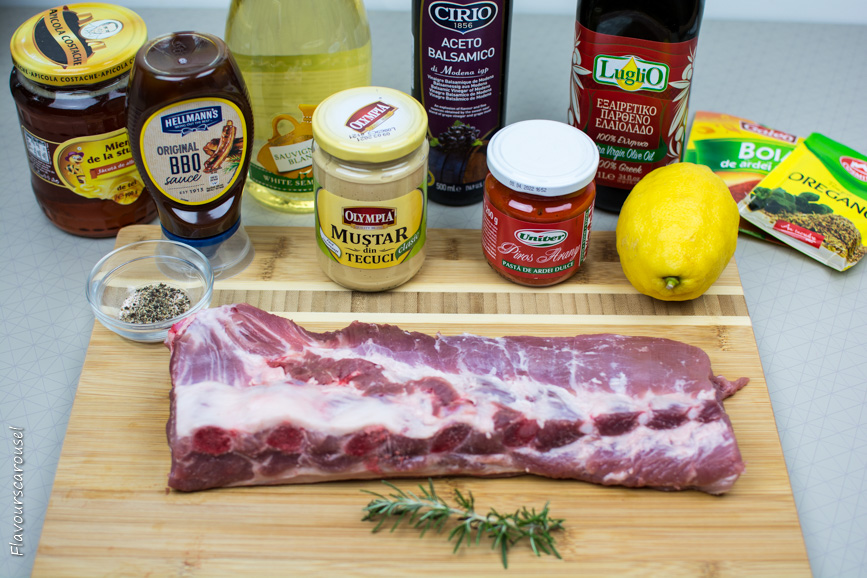 Intr-un vas incapator vom pune toate ingredientele pentru marinat: sucul de lamaie, uleiul de masline, otetul balsamic, mierea, pasta de ardei, boia, oregano, mustarul, sosul barbeque, pasta de rosii, sarea, piperul si crenguta de rozmarin pe care le amestecam pana se omogenizeaza devenind o pasta putin densa