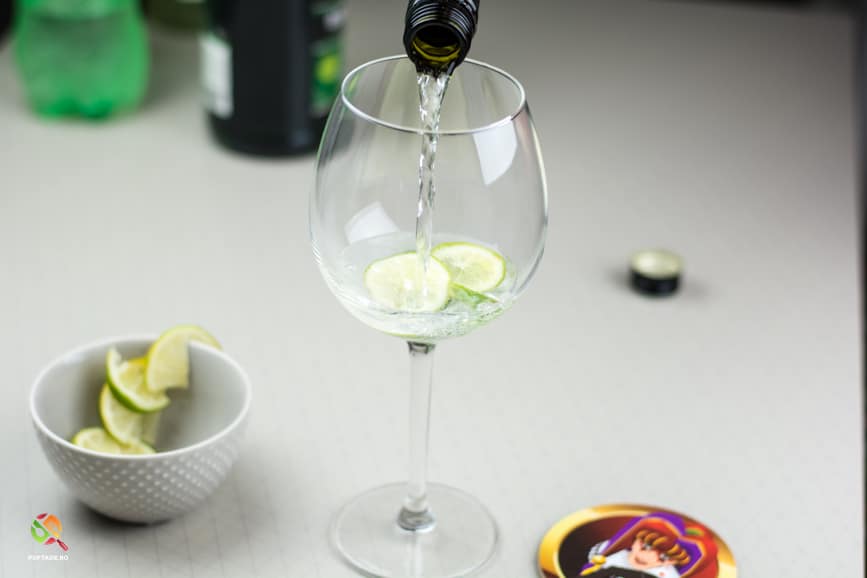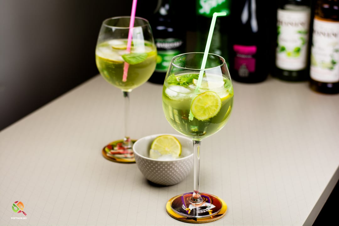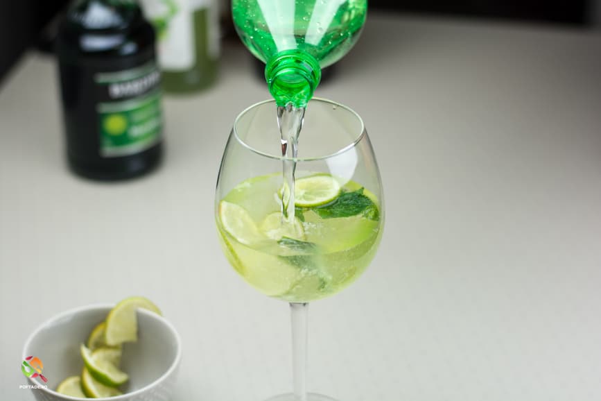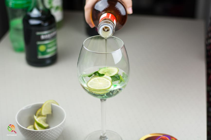 Peste acestea adaugam Prosecco, siropul de menta, siropul de soc, siropul de lime/lamaie si sucul Sprite (sau varianta alternativa aleasa - 150g) si amestecam cu ajutorul unui pai/lingurita