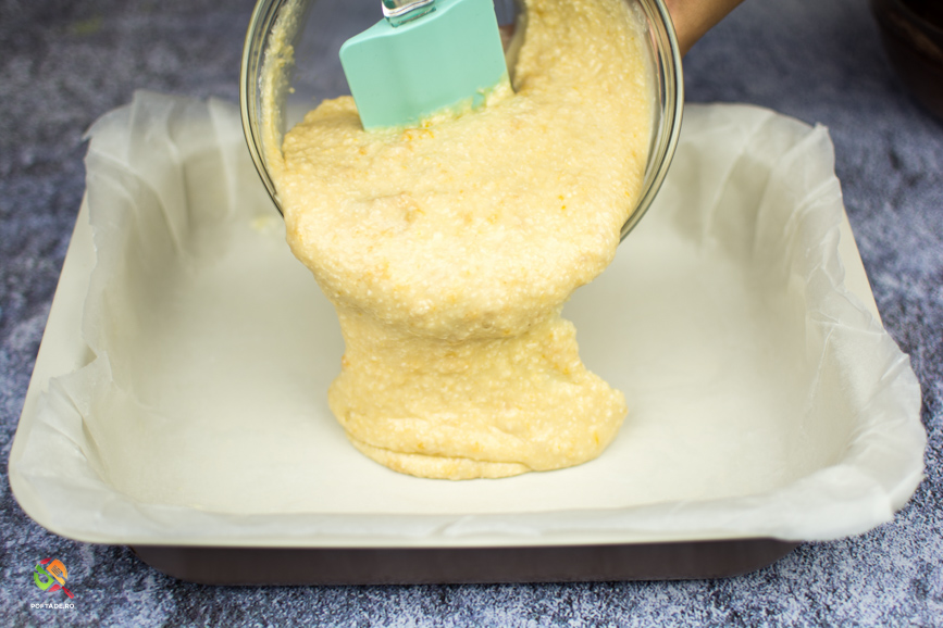 Se pregatesc ingredientele conform mentiunilor din sectiunea ingrediente. Pentru a salva timp, setam cuptorul pentru a se preincalzi la 185 grade, treapta din mijloc. Pentru aceasta reteta am folosit o tava cu dimensiunile de 29x22x6cm