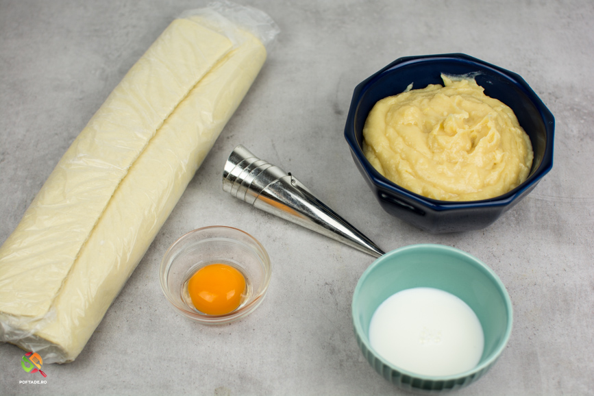 Se pregatesc ingredientele conform mentiunilor din sectiunea ingrediente. Pentru a castiga timp setam cuptorul sa se incalzeasca la 200 grade