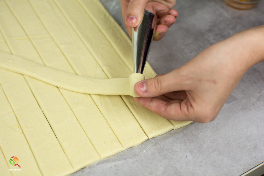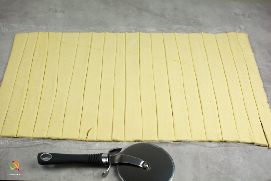 Intindem foaia de foietaj si taiem fasii cu latimea de aproximativ 3cm