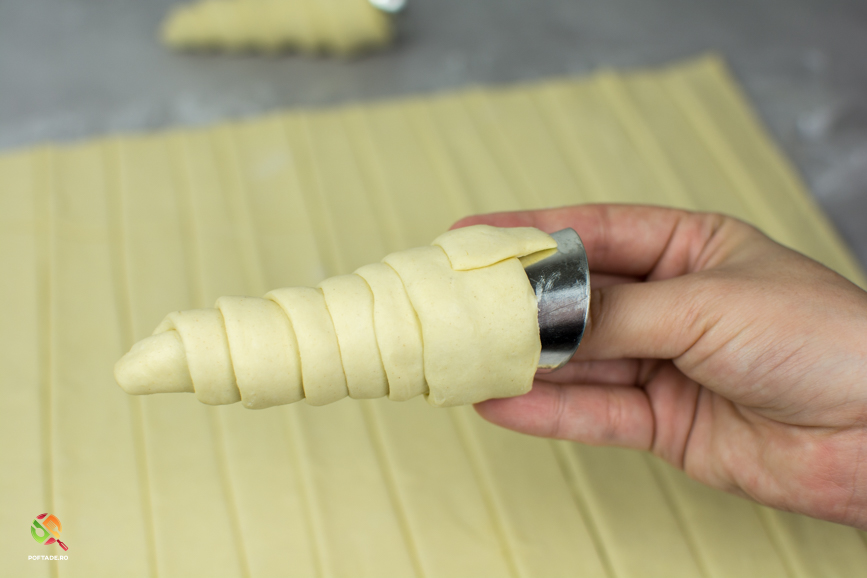 Luam capatul unei fasii de aluat si incepem sa o infasuram pe conul de aluminiu inca de la baza acestuia