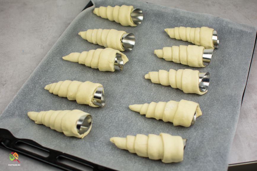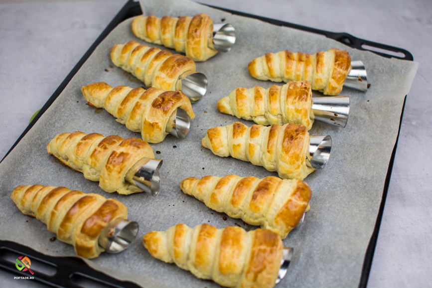 Punem rulourile in cuptorul preincalzit la 200 grade pentru 5 minute in partea de jos a acestuia si apoi inca 15-20 minute in partea de mijloc-sus. Daca observati ca acestea nu se umfla puteti porni ventilatia cuptorului la aceiasi temperatura. Aveti grija insa sa nu se arda, intrucat timpul poate varia de la un cuptor la altul. Dupa ce le-am scos din cuptor inlaturam conurile metalice si le lasam sa se raceasca