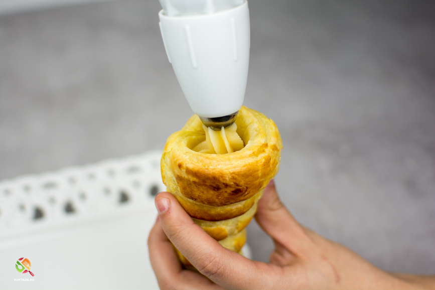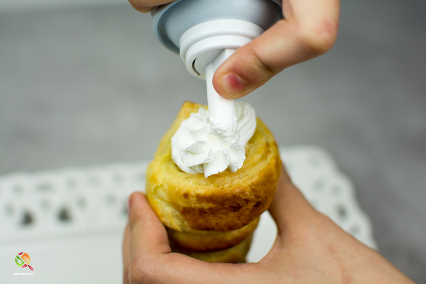 Pentru umplere am folosit crema de vanilie deja racita si cu ajutorul unui pos/sprit de bucatarie am umplut rulourile lasand putin spatiu si pentru frisca. Daca nu doriti sa le ornati cu frisca puteti sa le umpleti pana sus cu vanilie