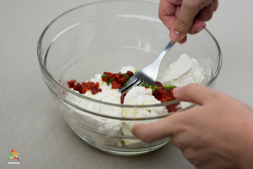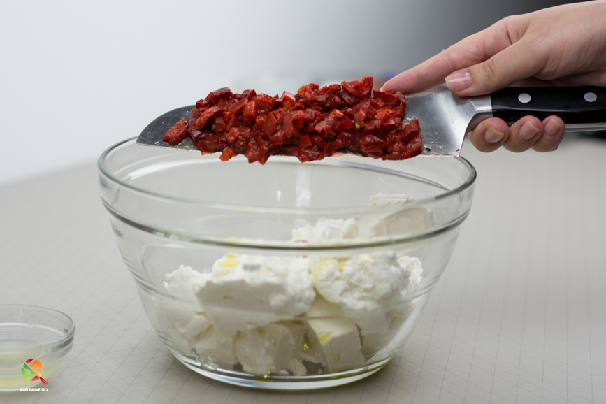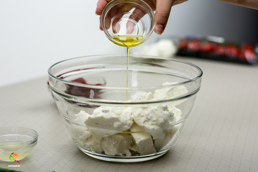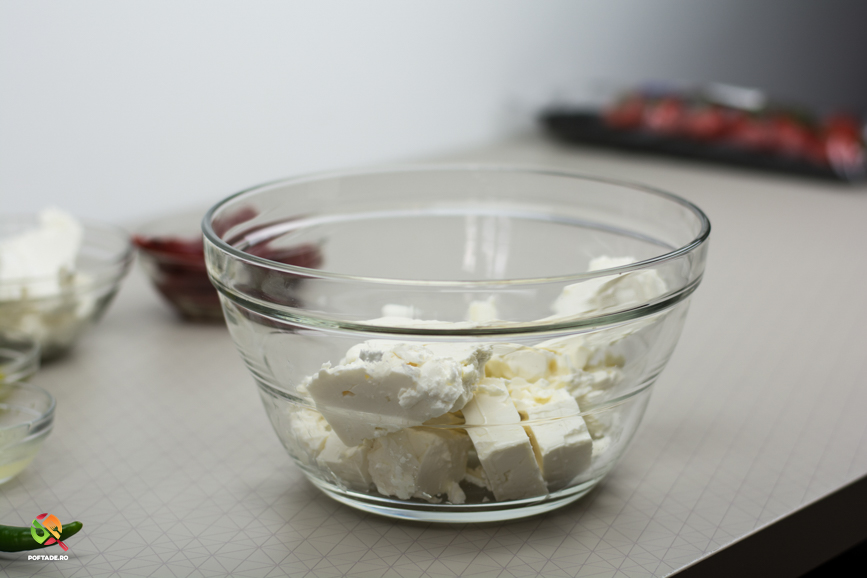 Branza feta preferabil spalata daca nu vrem sa iasa foarte sarata salata, se taie cubulete si se pune impreuna cu urda si smantana (sau branza de vaci proaspata) intr-un recipient unde sa avem loc sa amestecam toate ingredientele