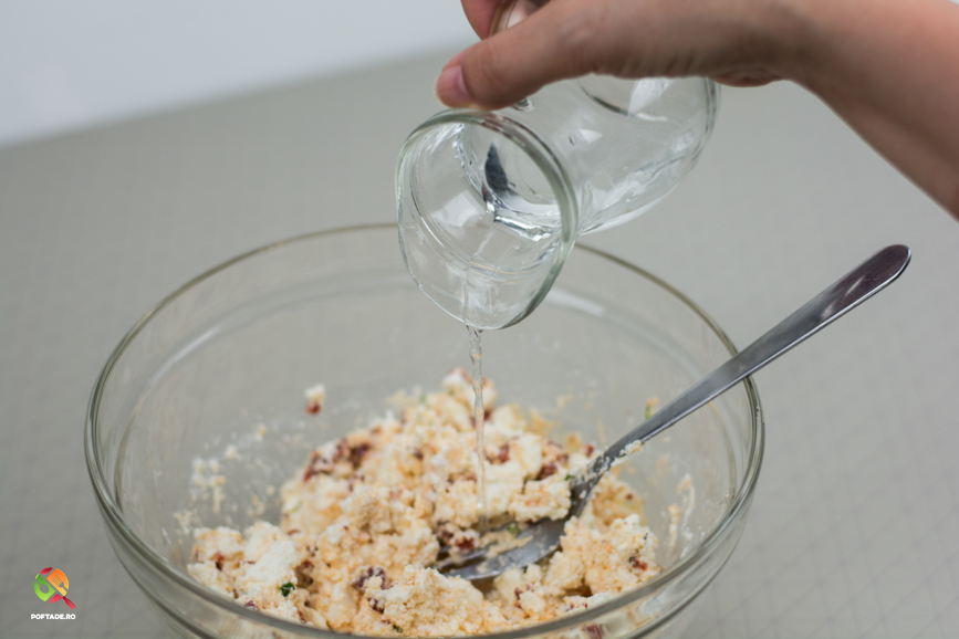 Adaugam sucul de lamaie si apa pentru a putea omogeniza salata. Adaugam apa pana obtinem consistenta dorita ce se poate intinde usor. Deasemenea apa ne ajuta sa obtinem un gust mai putin sarat.