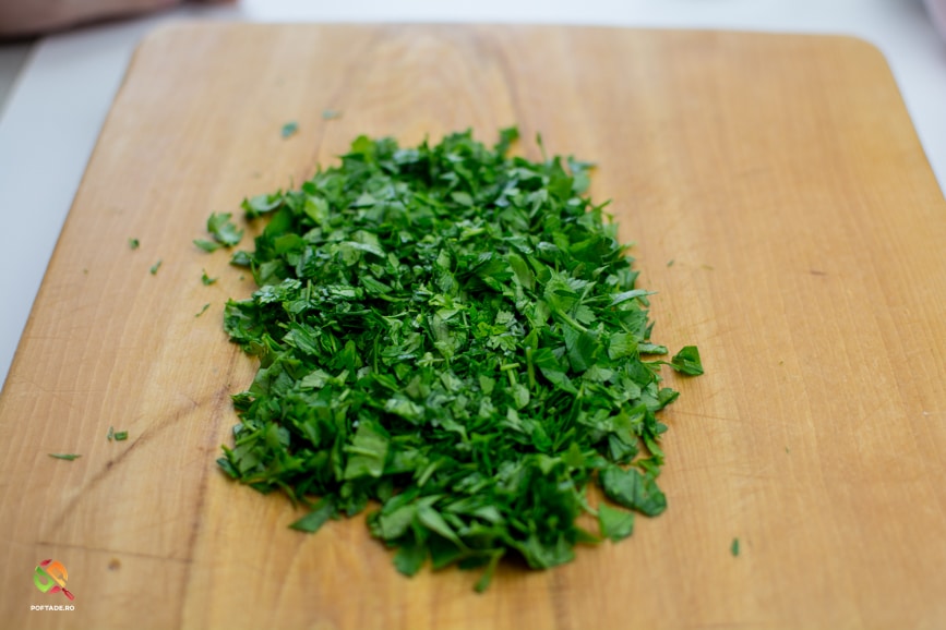 Din patrunjel alegem doar frunzele si le tocam (nu foarte marunt)