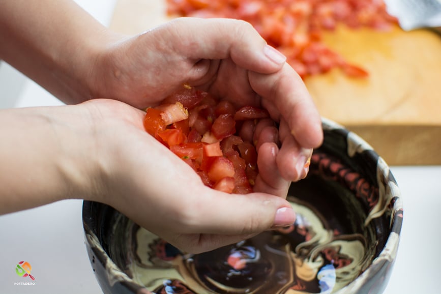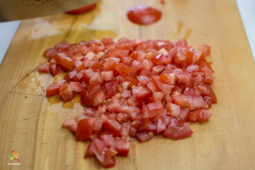 Taiem rosiile cubulete. Eu am folosit 3 rosii (aprox 300g) acestea sunt esentiale in aceasta salata de aceea este indicat sa avem o cantita consistenta de rosii raportate la celelalte ingrediente
