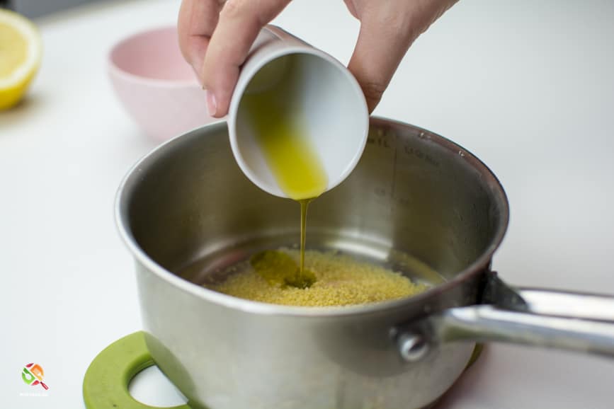 Separat ne vom ocupa de couscous respectiv intr-o craticioara vom pune apa la fiert impreuna cu sarea. Dupa ce acestea au dat in fiert oprim focul punem in aceasta couscous-ul si uleiul de masline pe care le amestecam putin si le acoperim cu un capac sau o farfurie si il lasam pentru 5 minute sau pana cand apa s-a absorbit in totalitate.