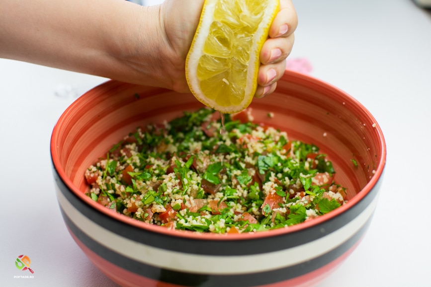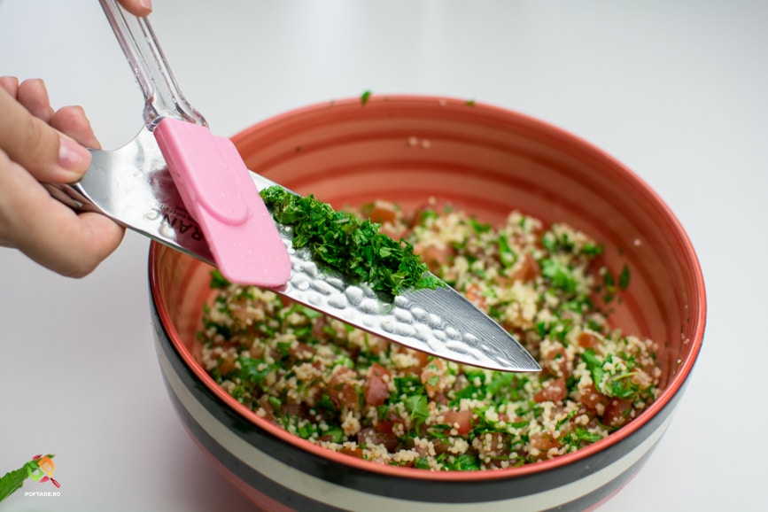 Salata Tabbouleh este foarte usor de preparat este bogata in vitamine si ofera un gust de prospetime. Tabbouleh-ul este un preparat aperitiv vegetarian ce poate fi servit si ca garnitura a unui preparat pe baza de carne, el fiind foate satios datorita couscous-ului.
