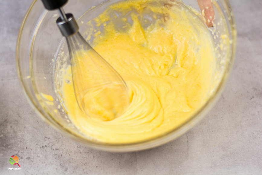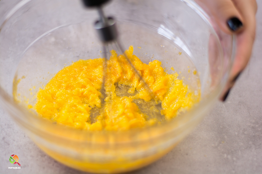 Separat punem galbenusurile impreuna cu zaharul si le amestecam cu telul/mixerul pana se omogenizeaza