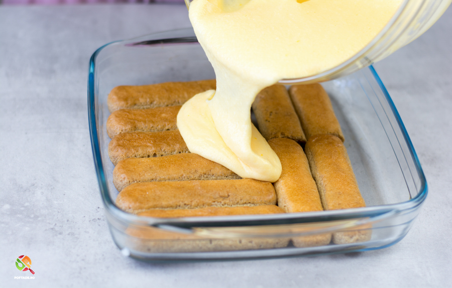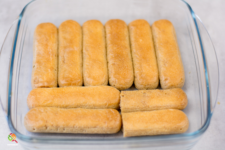 Inainte de a ne apuca de compozitie trebuie sa masuram cate piscoturi intra pe un rand in vasul ales (vom avea 2 randuri) si taiem daca este nevoie din cateva pentru a fi acoperita uniform toata suprafata.