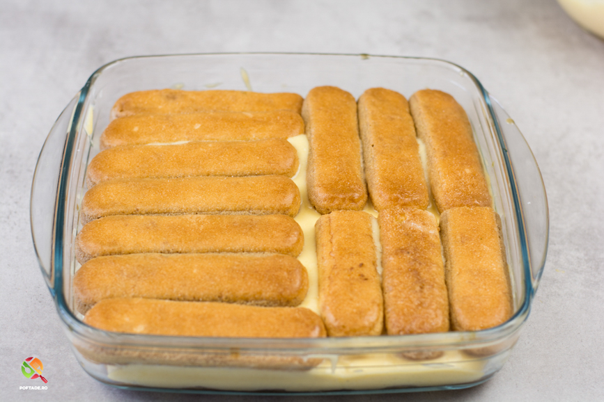 Apoi, punem si al-doilea strat de piscoturi inmuiate in cafea si peste acestea, restul de crema