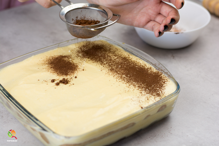 Peste crema vom pune cu ajutorul unei site cacaoa amara acoperind toata suprafata. Prajitura se pune la frigider si se serveste a-doua zi (min 10 ore la frigider)