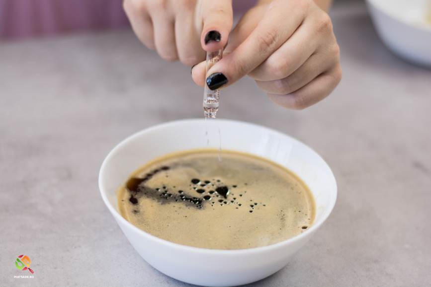 Punem amaretto (sau alta tarie din ingrediente) si esenta de migdale in cafeaua proaspata si amestecam