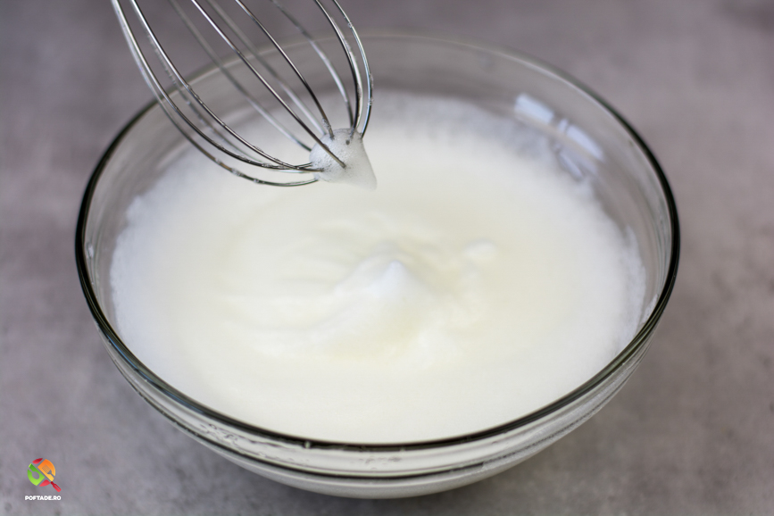 Intr-un alt vas adaugam albusurile cu putina sare si le batem cu mixerul/telul la viteza mare pana se fac spuma. Acesta se adauga treptat peste compozitia de galbenusuri, zahar si mascarpone si se integreaza prin miscari circulare largi, pentru a avea o compozitie aerata