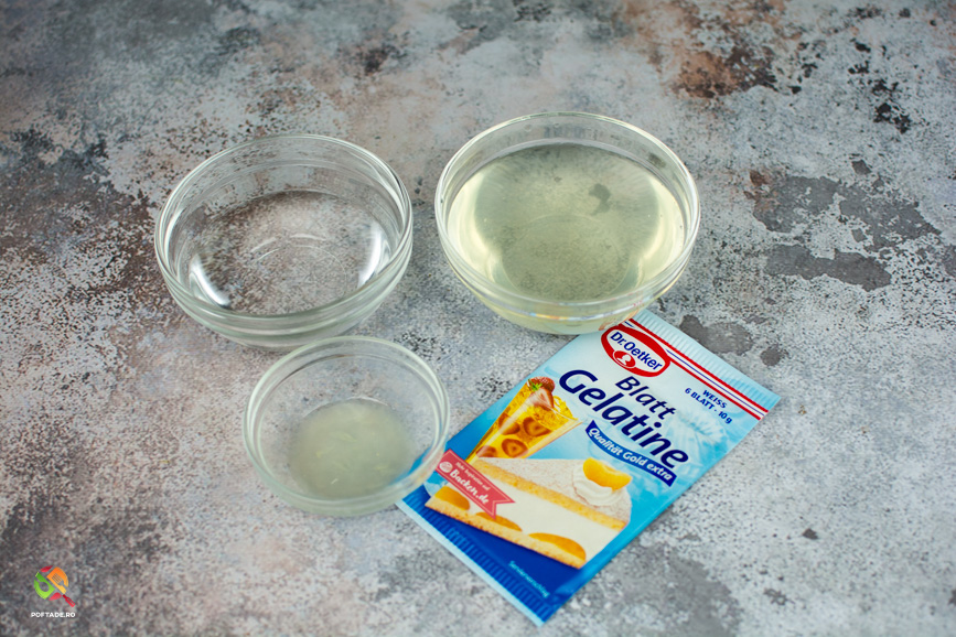 Punem foile de gelatina in apa si le lasam sa stea pentru 5 minute