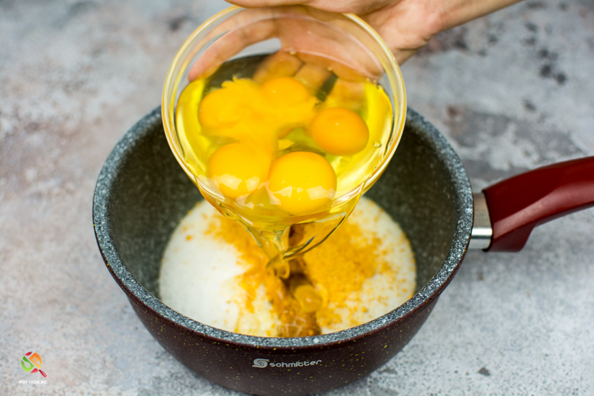 Intr-o craticioara punem la foc mic ouale, zaharul, esenta de vanilie si coaja de portocala