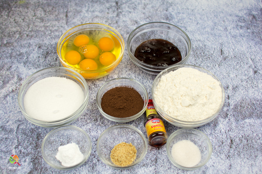 Pregatim ingredientele pentru blatul de cacao conform mentiunilor din sectiunea Ingrediente. Pentru a castiga timp setam cuptorul al 175 grade, treapta de mijloc