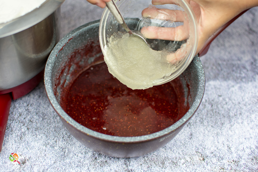 Peste capsunile cu zahar adaugam gelatina si amestecam pana la omogenizare