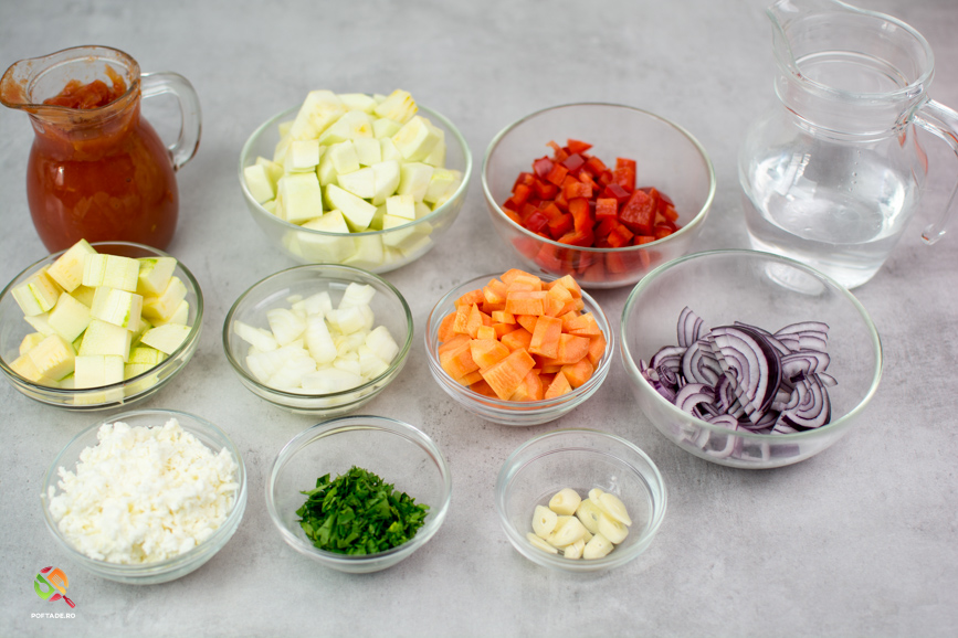 Intr-o craticioara punem la calit in putin ulei legumele: ceapa, dovlecel, zucchini, ardei, morcov si usturoi