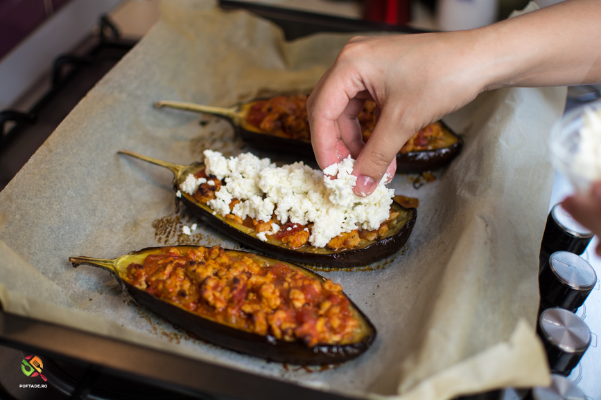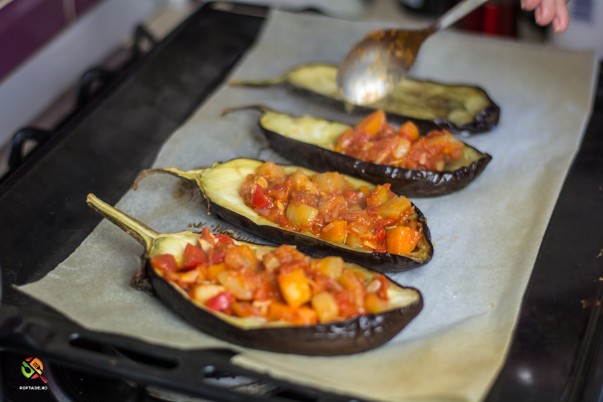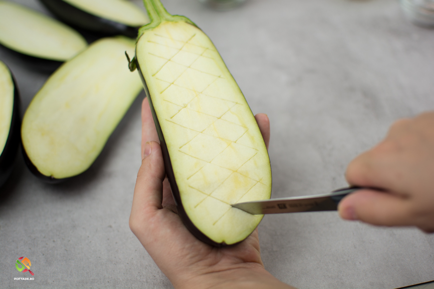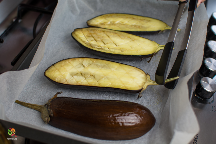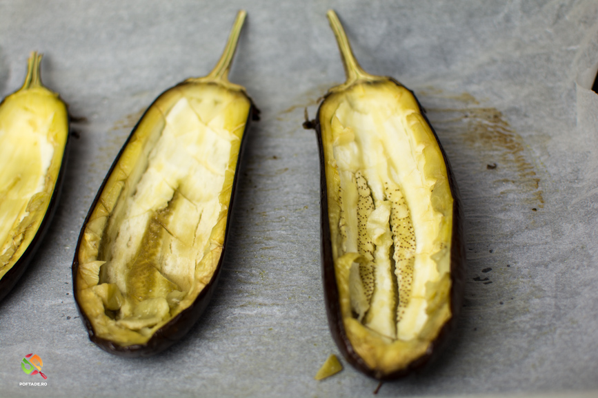 Odata ce au trecut cele 30 minute, scoatem vinetele din cuptor si cu ajutorul unei linguri scobim interorul astfel incat sa lasam aproximativ 1 cm de pulpa pe margini