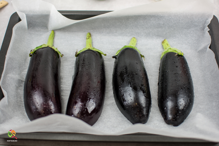 Intr-o tava tapetata cu hartie de copt punem vinetele si le dam la cuptor la 200 grade pentru 30 minute (15 minute pe fiecare parte), treapta din mijloc (fara ventilatie)