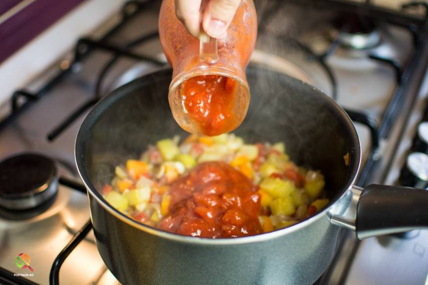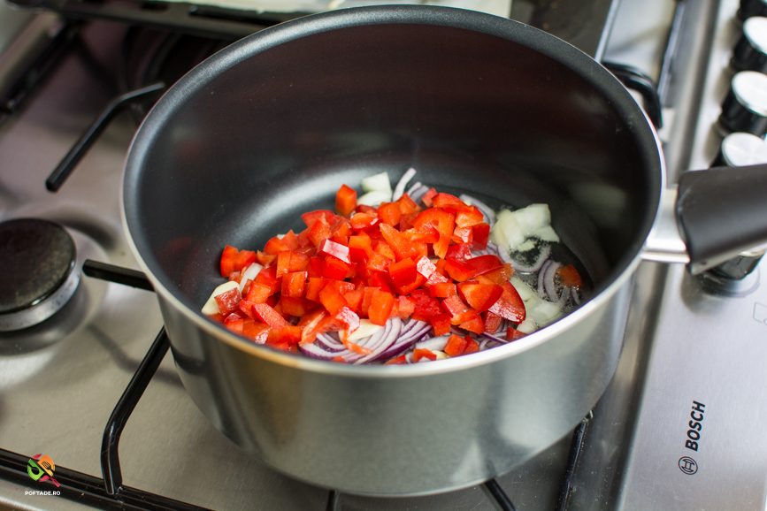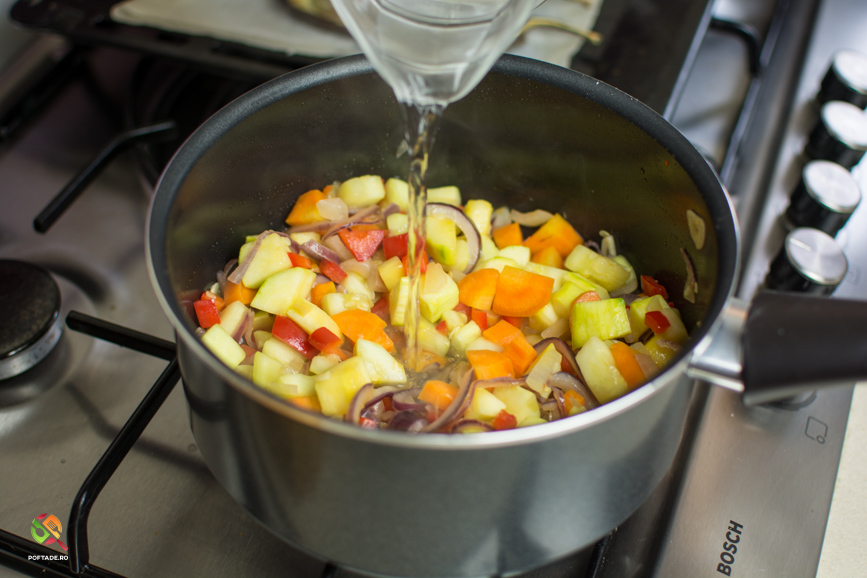 Dupa ce s-au calit legumele adaugam apa si lasam sa fiarba pana ce legumele s-au inmuiat si apa a scazut in mare parte